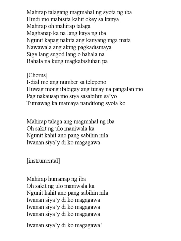 Mahirap talagang magmahal ng syota ng iba Hindi mo mabisita kahit okey sa kanya Mahirap oh mahirap talaga Maghanap ka na lang kaya ng iba Ngunit kapag nakita ang kanyang mga mata Nawawala ang aking pagkadismaya Sige lang sugod lang o bahala na Bahala na kung magkabistuhan pa chorus I-dial mo ang number sa telepono. Y di ko magagawa Iwanan siya.