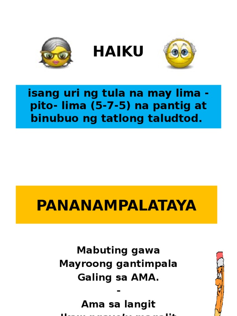 To compare the Japanese haiku has 17 phonetic units divided into three phrases of 5 7 and 5 units respectively. Ang HAIKU ay isang uri ng tula na may lima - pito- lima 5-7-5 na pantig at binubuo ng tatlong taludtod. Batid niyang darating ang araw na aahon din siya sa paghihikahos na nararanasan.